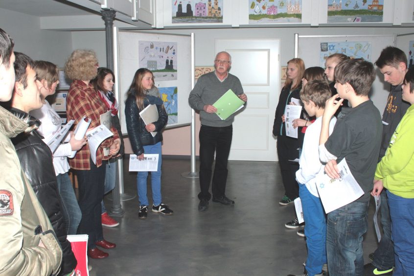 Gleich am nächsten Tag, dem 10. April 2013 nutzte die 7. Klasse der Realschule Plus Niederzissen mit ihrer Klassenlehrerin Katharina Volkert die Gelegenheit zu einem Besuch in der Ausstellung, nachdem sie schon zuvor im Unterricht die Symbole des Judentums behandelt hatten. Arbeitsblätter und Notizen wurden genutzt, um sich mit den Bildern eingehender zu beschäftigen. Ein besonderes Highlight war danach noch, dass mehrere Kartons mit Original-Resten von Gebetsriemen, Schriftrollen und vieles andere mehr bestaunt und sogar vorsichtig in die Hand genommen werden konnten – ein besonderes Gefühl, angesichts der Originale, die zum Teil mehrere hundert Jahre alt sind. Diese Möglichkeiten gibt es so in keinem größeren Museum – und das Interesse der Schüler bei dieser Original-Demonstration und Erklärungen dazu sprach für sich.
