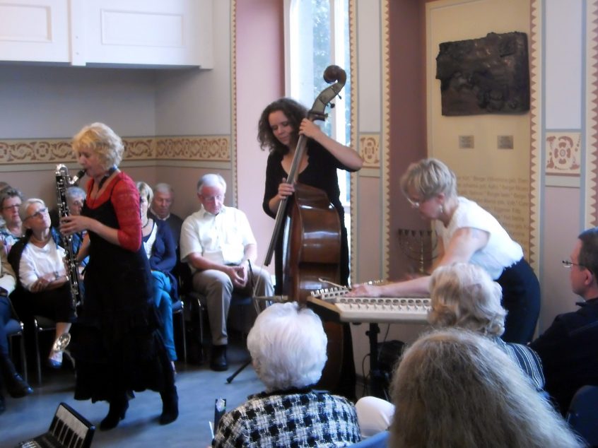 Niederzissen. –ab-. Der Besuch des Kulturprogramms in der ehemaligen Synagoge in Niederzissen war am Samstag, 24. August 2013, wieder einmal ein Erlebnis für die Gäste. Klezmers Techter waren zu Gast, ein Trio aus Gabriele Kaufmann (Klarinette, Bassklarinette), Almut Schwab (Akkordeon, verschiedene Flöten, Hackbrett) und Nina Hacker (Kontrabass). Sie boten Klezmer-Musik, also Festmusik jüdischer Herkunft und Prägung, die vor allem im Osteuropäischen Raum gespielt wird und wurde. Und so wie die Klezmorin, die Musiker, auf ihren Reisen oft fremde Einflüsse aus anderen „Musiken“ aufgenommen haben, so haben auch Klezmers Techter die Klezmer-Musik angereichert und kombiniert – mit Tango beispielsweise, mit Elementen des Jazz, oder auch mit orientalischen Klängen.