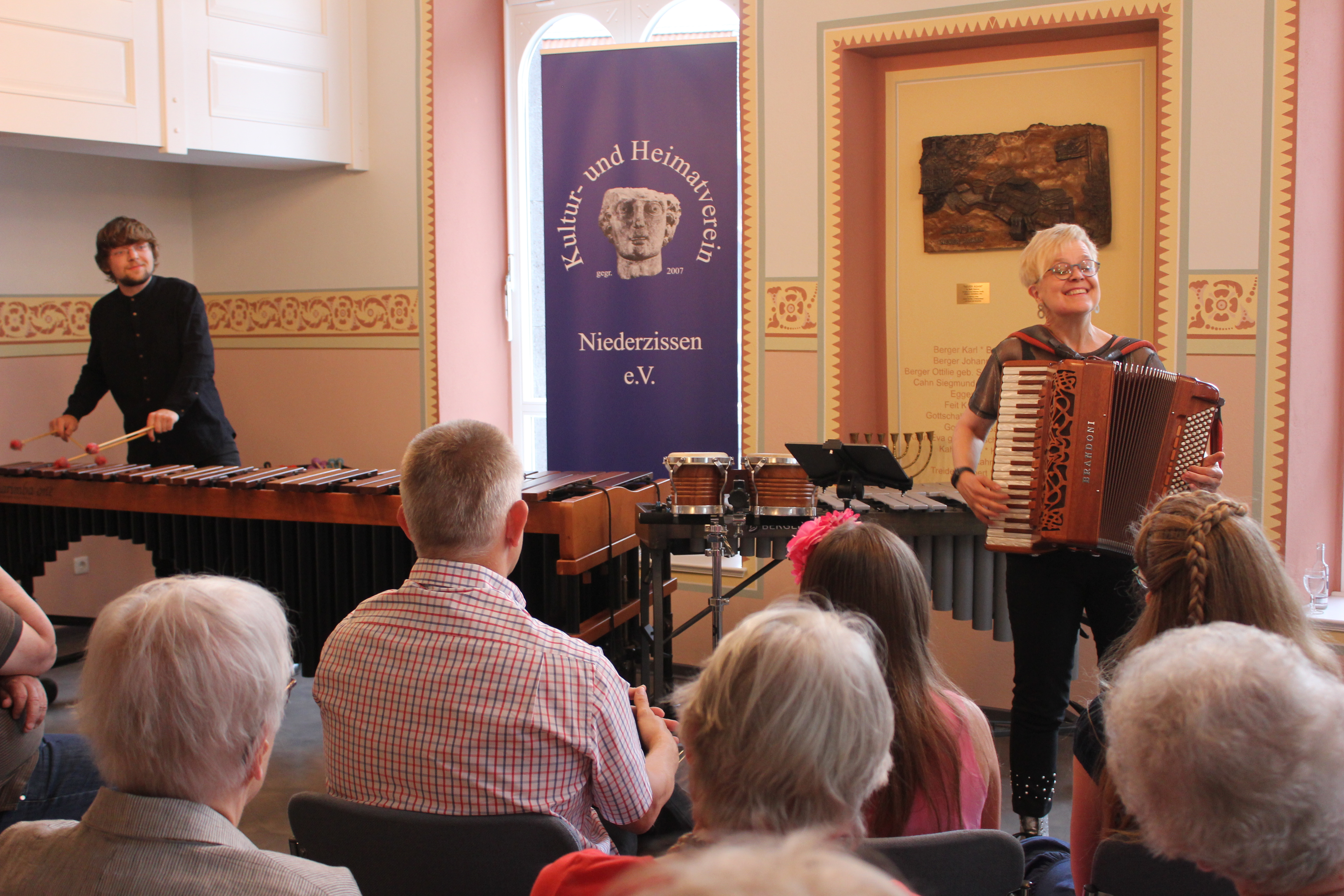 Mit leisen Tönen der Marimba und gemächlich einsetzendem und sich steigerndem Akkordeon, begann das gut zweistündige Konzert des DUO‘s ADAFINA in der ehemaligen Synagoge Niederzissen und ließ die Zuhörer gleich ahnen, was sich hinter dem Name des Duos verbirgt. Adafina ist die Bezeichnung für den traditionellen Shabatteintopf der spanischsprechenden Juden. Einen solchen musikalischen Eintopf mit reichlich Gewürzen versprach auch die unkonventionelle Besetzung mit Marimba, Vibraphon und Percussion, gekonnt gespielt vom jungen Jan Köhler sowie Almut