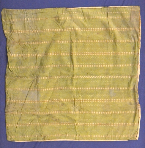 The cover shown here, made from light green silk cloth with interwoven stripes of blocks, is very well preserved. It is sewn from seven separate parts, suggesting that the cloth had been used for clothing before and found a secondary use as a material for the cover. The lining is made from simple, unbleached, and handwoven linen. In less affluent Jewish congregations, especially in rural areas, this use of high-quality fabric remnants to create textiles for the Synagogue was quite common.