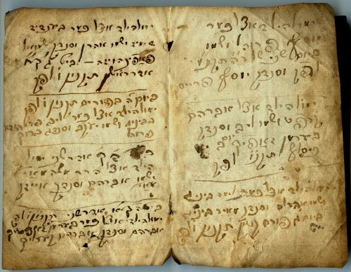 The four handwritten double pages of this Mohel-book contain 34 readable entries, made between 1795 and 1809. On these pages, the Mohel recorded the date of the circumcision, the name of the father, the godfather (Sandek) and the child. The pages are embedded in a contemporary prayer book in octavo format.