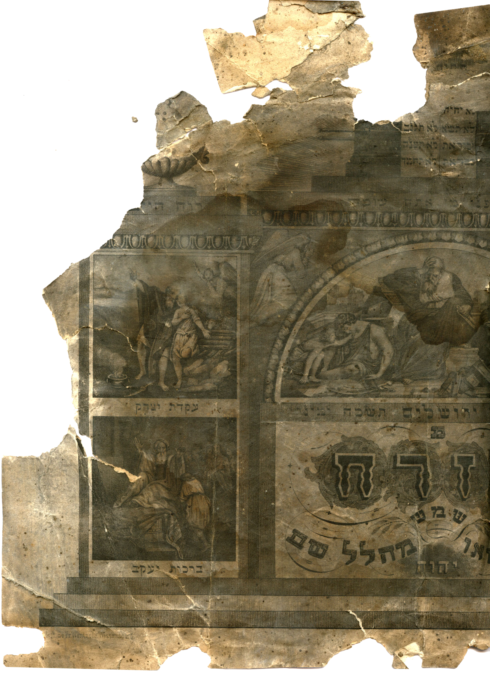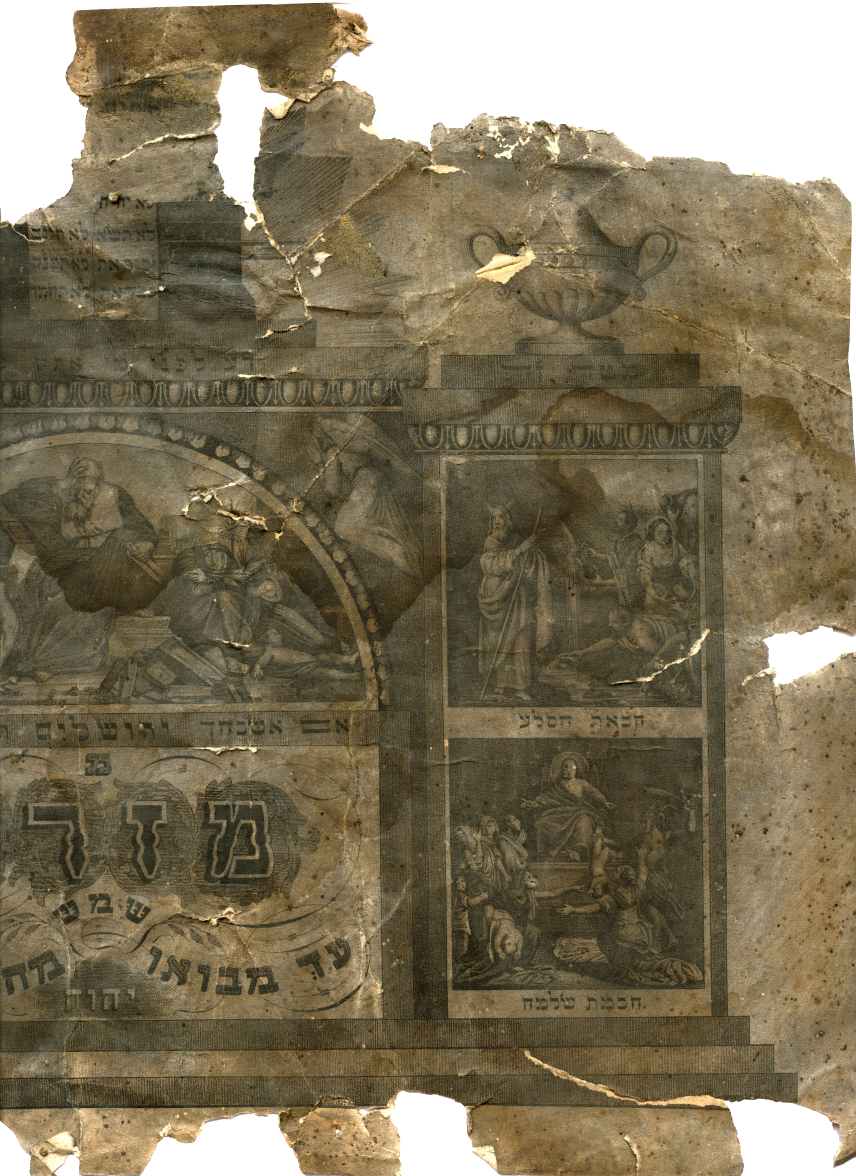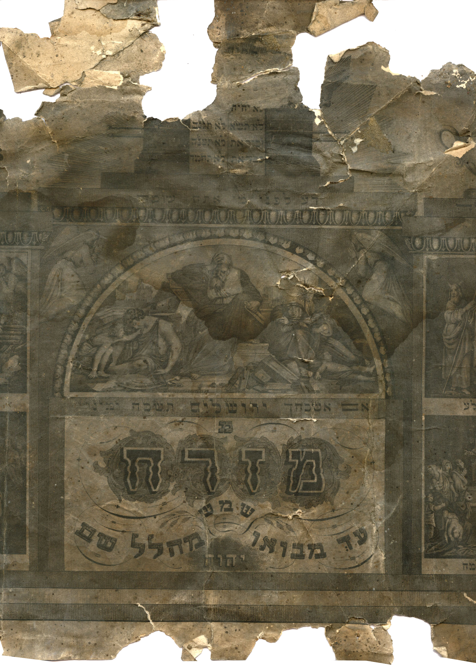 This lavishly decorated Mizrah sheet is one of the few artistic prints found in the Genizah. Architectural elements structure the sheet. The Hebrew lettering “Mizrah” forms the center of the sheet, surrounded by illustrations of biblical themes as well as allusions to the Temple of Jerusalem. On the upper edge of the image, the Ark of the Covenant and the tablets containing the commandments can be seen. Beneath them the quote “Know before whom you will ultimately give judgement and accounting” (Pirkei Avot 3:1) is printed. Further below, beneath the round arch, mourning people are seen sitting in a field of debris. They represent the accompanying verse of psalm 137:5: “If I forget you, O Jerusalem, let my right hand forget its skill!”. To both sides of them, well-known scenes from the bible are depicted, including king Solomon. This print appears to have been rather popular at the time, as it has been found in other cities as well.